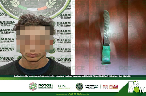 Las autoridades estatales detuvieron a Jesús “N” de 21 años de edad, después de ser captado en la colonia Cactus bajo el operativo “Cazador”, con un cuchillo de 36 centímetros, con el que deambulaba, por ello se le despojó del arma prohibida y se le hizo de conocimiento que sería arrestado por el probable delito de portación de un arma blanca.