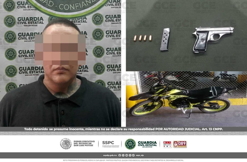 San Luis Potosí, S.L.P.- Tras los operativos de reacción y disuasión de hechos delictivos, una persona resultó detenida por agentes de Guardia Civil Estatal (GCE), por el probable delito de portación de un arma de fuego.