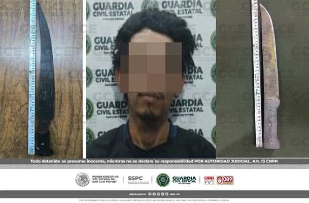 Una de las detenciones tuvo lugar en la colonia Las Flores, ahí fue detenido Rodolfo “N” de 35 años de edad, luego de asegurarle un machete con el que deambulaba en esta zona; mientras que en el municipio de Soledad de Graciano Sánchez, en la colonia Praderas del Maurel, se detuvo a un joven de 15 años, luego de asegurarle un machete de 58 centímetros.