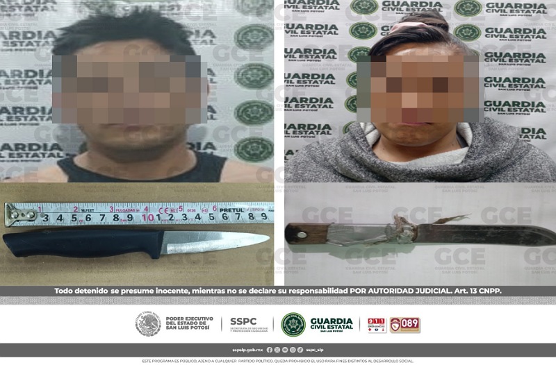 San Luis Potosí, S.L.P.- En diferentes acciones de seguridad y vigilancia, efectivos de la Guardia Civil Estatal (GCE) detuvieron a dos personas, por el probable delito de portación de armas punzocortantes.