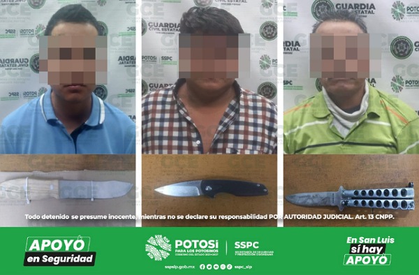 S.L.P.- Diferentes operativos de seguridad, desdoblados por la Guardia Civil Estatal (GCE), permitieron la detención de tres hombres, quienes presuntamente se desplazaban con armas punzocortantes, incurriendo en un hecho con apariencia de delito.