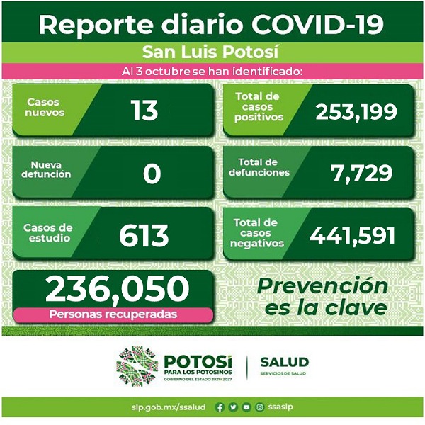 En cuanto a los casos Covid-19 en el Estado, se dan a conocer 13 nuevos contagios, confirmando el Comité Estatal para la Seguridad en Salud y los Servicios de Salud 253 mil 199 casos totales de esta enfermedad.
