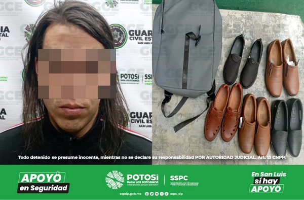 San Luis Potosí, S.L.P.- Acciones preventivas emitidas por la Guardia Civil Estatal (GCE), para combatir los delitos patrimoniales permitieron la detención de un individuo, quien presumiblemente trató de huir con varios pares de zapatos, con un monto total aproximado de 5 mil pesos.