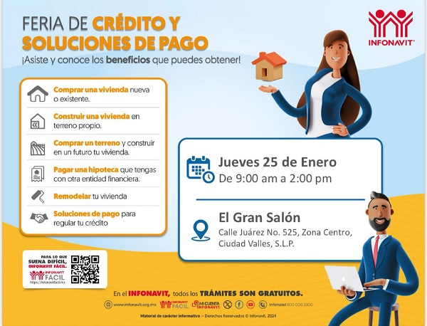El Instituto del Fondo Nacional de la Vivienda para los Trabajadores (Infonavit) realizará Feria de Crédito y Soluciones de Pago en Ciudad Valles, San Luis Potosí, con el objetivo de que las personas conozcan sus productos financieros y sus diferentes alternativas para ponerse al corriente en el pago de sus mensualidades, en caso de que tengan un financiamiento y enfrenten dificultades para pagarlo.