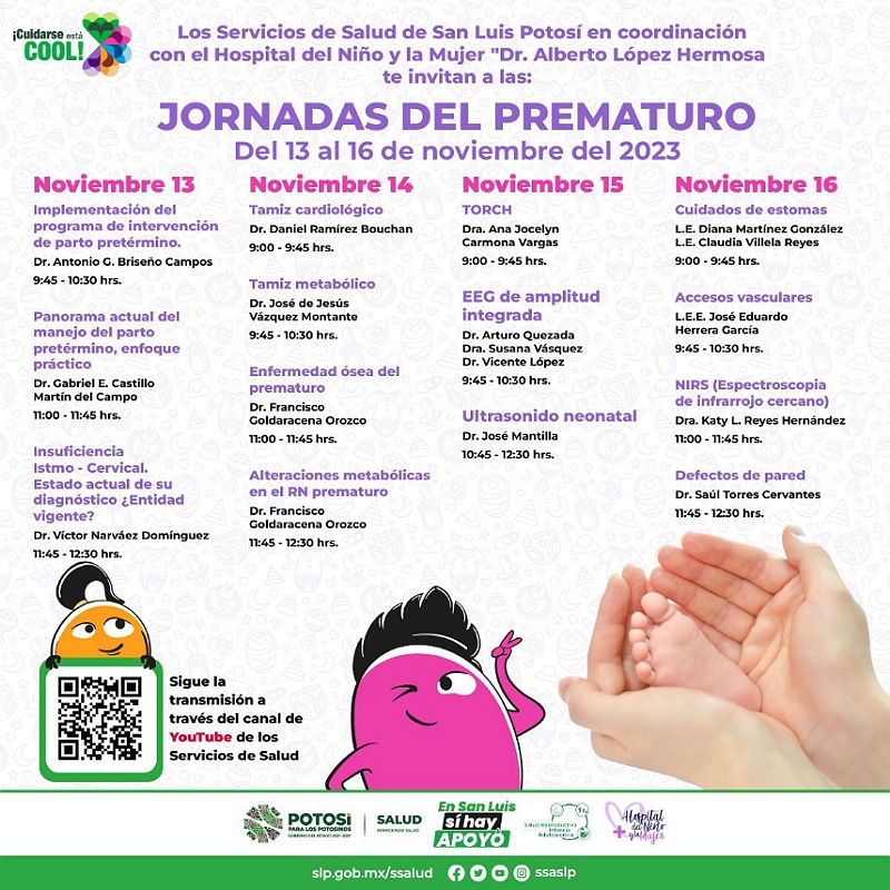 Posteriormente de las jornadas, y en vísperas del Día Mundial de Prematuro próximo viernes 17 de noviembre, los Servicios de Salud de San Luis Potosí a través del Hospital del Niño y la Mujer tendrán la apertura de actividades donde se unirán y participarán familias con un hija o hijo prematuros (nacen antes de las 37 semanas de gestación), para unir esfuerzos y promover los cuidados en casa de la persona recién nacida prematura además de la estimulación temprana y neurodesarrollo en el hogar.