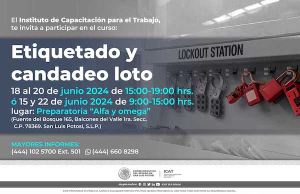 Como parte de la amplia oferta de profesionalización para que las y los potosinos accedan a empleos mejor pagados y formen parte del desarrollo económico que impulsa el Poder Ejecutivo del Estado, el Instituto de Capacitación para el Trabajo (Icat), invita a participar en el curso “Etiquetado y candadeo LOTO” para el bloqueo y señalización de equipo industrial en trabajos de mantenimiento o reparación.