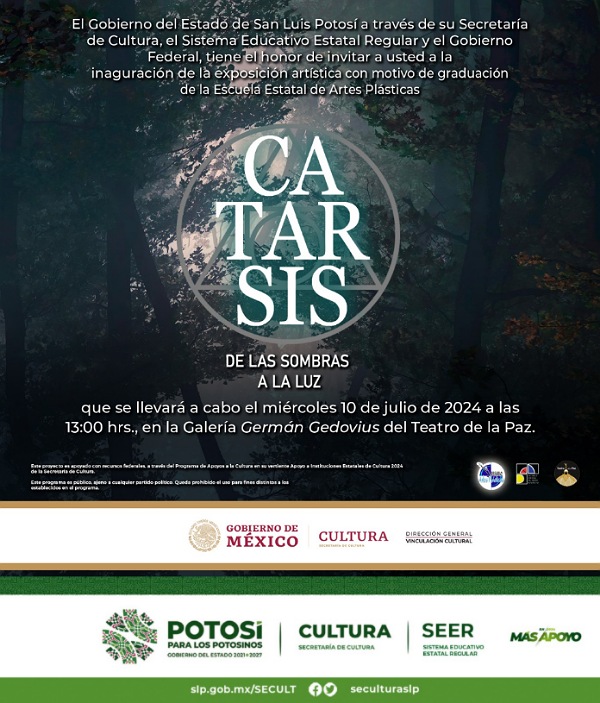 El Gobierno de Estado de San Luis Potosí, a través de la Secretaría de Cultura, invita al público a la inauguración de la exposición plástica colectiva “CATARSIS, de las sombras a la luz” que se llevará a cabo este miércoles 10 de julio a las 12:00 h, en la Galería Germán Gedovius del Teatro de la Paz, entrada libre.