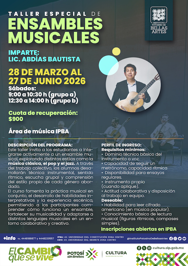 La Secretaría de Cultura de Gobierno del Estado invita al público interesado en la práctica musical a participar en el Taller especial de Ensambles Musicales, que será impartido por Abdías Bautista del 28 de marzo al 27 de junio de 2026, con dos opciones de horario sabatino: de 9:00 a 10:30 horas y de 12:30 a 14:00 horas, en las instalaciones del Instituto Potosino de Bellas Artes. Las inscripciones ya se encuentran abiertas; la cuota de recuperación es de 900 pesos.