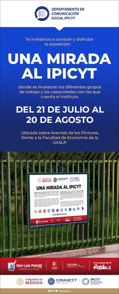 El Instituto Potosino de Investigación Científica y Tecnológica, IPICYT, estará presente en la Galería Perimetral del Parque de Morales, a través de 20 carteles interactivos el público en general podrá adentrarse al quehacer de los investigadores que laboran en este Centro Público de Investigación.