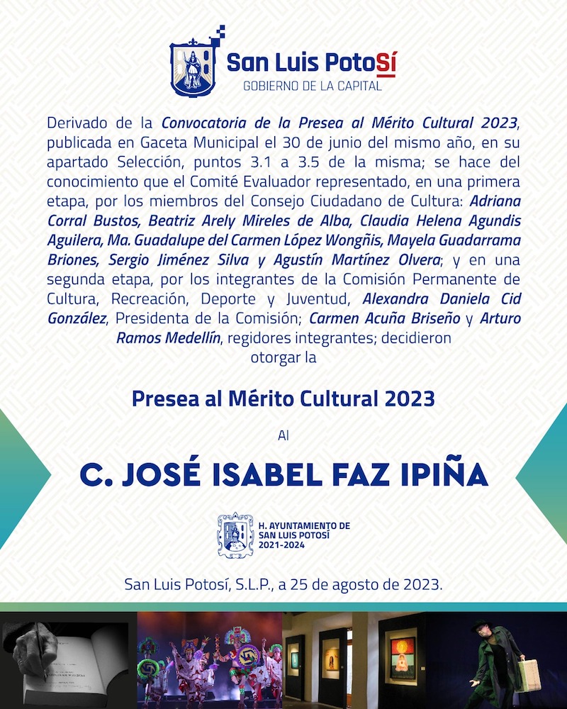 Los Regidores de la Comisión de Cultura, Recreación, Deporte y Juventud, Daniela Cid González, Carmen Acuña Briseño y Arturo Ramos Medellín, determinaron por unanimidad que el C. José Isabel Faz Ipiña, cuenta con los merecimientos suficientes para que se le otorgue la Presea al Mérito Cultural 2023, que entrega el H. Ayuntamiento de San Luis Potosí.