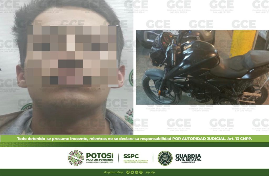 San Luis Potosí, S.L.P.- Dentro de las acciones de seguridad y vigilancia, encaminadas a preservar la paz pública e inhibir actos delictivos, un joven fue detenido en la zona metropolitana después de que fuera sorprendido a bordo de una motocicleta que contaba con reporte de robo.