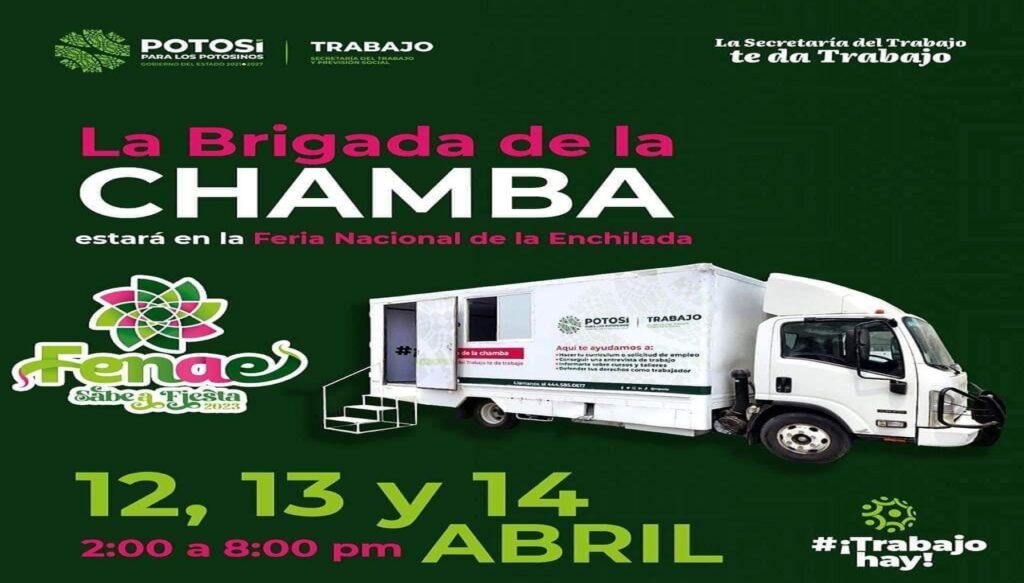 En el marco de la Feria Nacional de la Enchilada que se celebra en el municipio de Soledad de Graciano Sánchez, del 8 al 16 de abril, y con la finalidad de impulsar a los buscadores de empleo que existen en el municipio, este 13 y 14 de abril, estará en la localidad “La Brigada de la Chamba”.