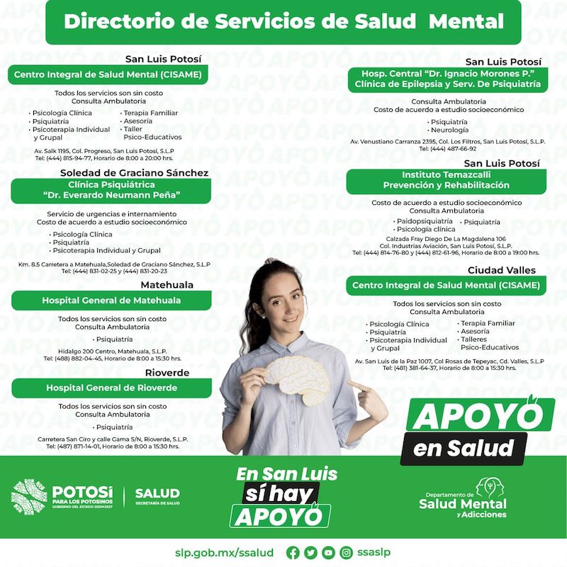 En los Servicios de Salud contamos con los Centros Comunitarios de Salud Mental y Adicciones, (CECOSAMA) y los Centros Integrales de Salud Mental (CISAME), que son unidades de atención ambulatoria y gratuita. La salud mental es el epicentro de donde fluye la paz, da lugar a un desarrollo integral, que repercute en las relaciones interpersonales, la vida familiar y la integración social.