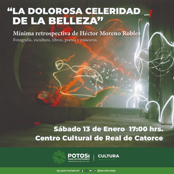 En San Luis Potosí si hay apoyo en cultura para creadoras y creadores, por lo que la Secretaría de Cultura de Gobierno del Estado, invita al público en general a la inauguración de la exposición “La dolorosa celeridad de la belleza” Mínima retrospectiva de Héctor Moreno Robles, que se llevará a cabo el sábado 13 de enero a las 17:00 h, en el Centro Cultural de Real de Catorce, entrada libre.