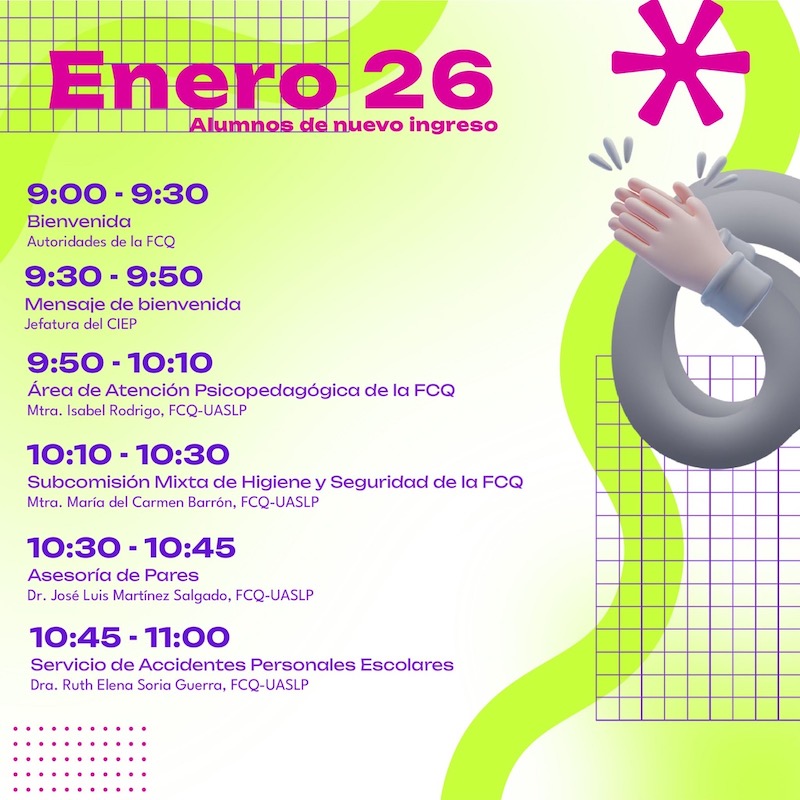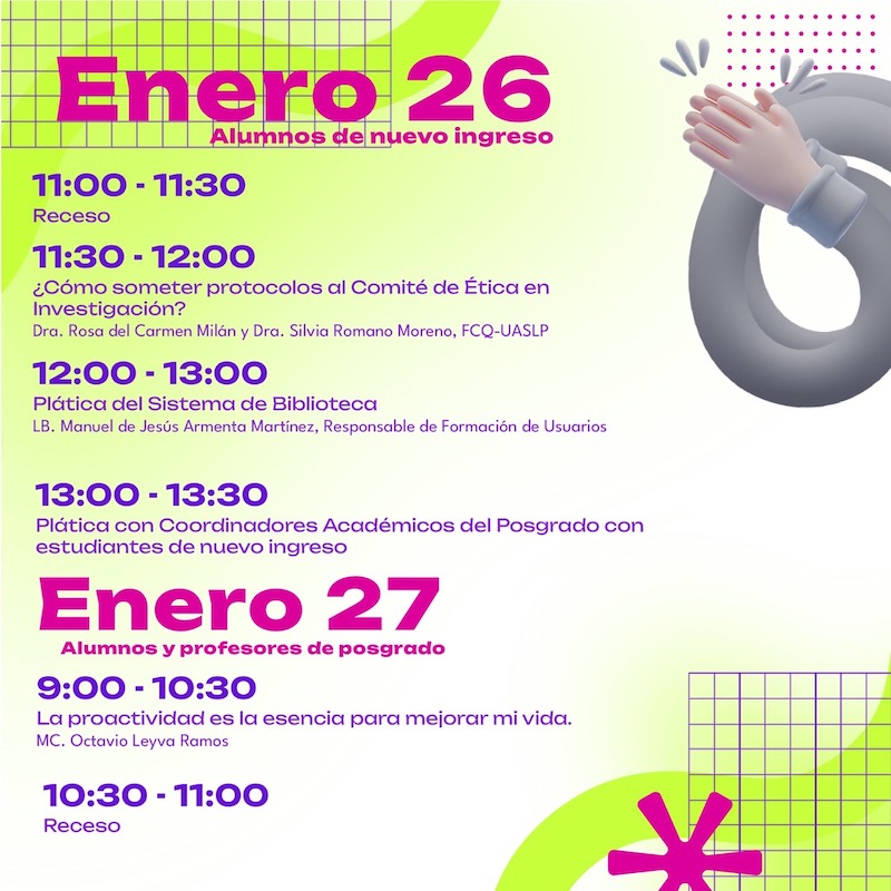 Desde este lunes 26 y hasta el 30 de enero, la Facultad de Ciencias Químicas (FCQ) de la Universidad Autónoma de San Luis Potosí (UASLP) es sede de la 3ª Semana de Posgrados “Por un crecimiento integral y equilibrado”, evento que integra actividades culturales, artísticas y deportivas con el propósito de impulsar el bienestar, la convivencia y el sentido de comunidad, dirigido a estudiantes de nuevo ingreso, alumnos y profesores de posgrado.