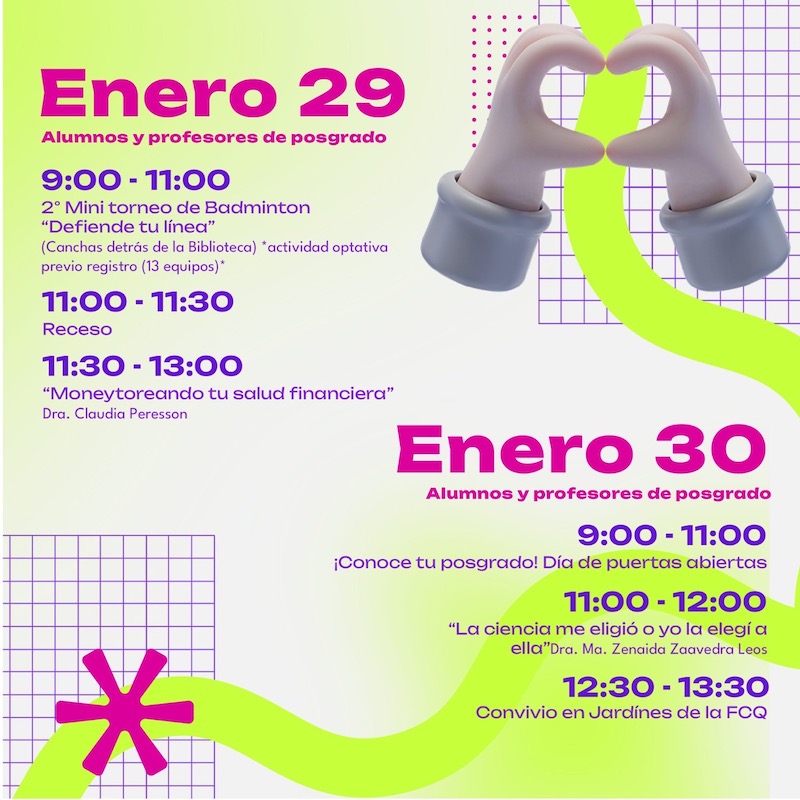 El programa contempla diversas pláticas y talleres, entre ellos “La proactividad es la esencia para mejorar mi vida”, impartida por el MC. Octavio Leyva Ramos el martes 27 de enero, de 9:00 a 10:30 horas; la charla “Gestión estratégica del tiempo para la productividad en investigación”, a cargo de la MC. Verónica Rueda, el miércoles 28 de enero, de 10:30 a 12:30 horas; así como la plática orientada a la salud financiera “Moneytoreando tu salud financiera”, impartida por la doctora Claudia Peresson, a las 11:30 horas, en las instalaciones del plantel.
