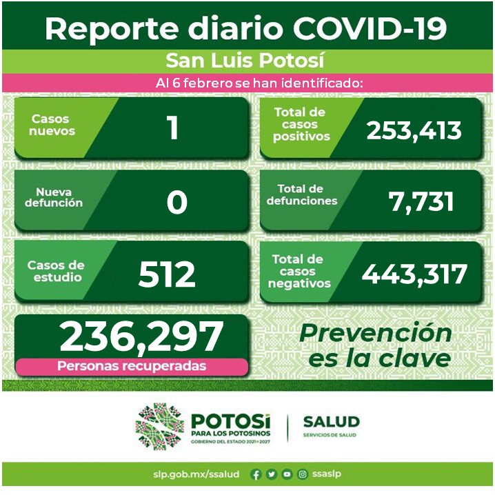 Un caso más por Covid en la entidad, suma SLP 253 mil 413 casos totales.