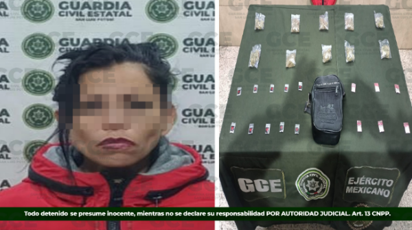 Los hechos fueron durante los trabajos desplegados en la capital potosina, sobre la colonia Los Reyitos, ahí fue detenida Janet “N” de 37 años de edad, luego de asegurarle 16 dosis de “cristal” y 10 de marihuana.