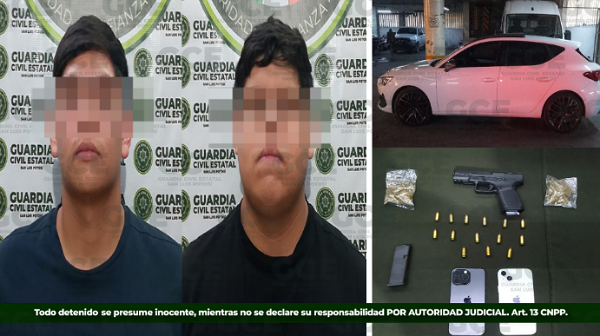 Nuestros agentes de la Guardia Civil Estatal, en coordinación con elementos del Ejército mexicano, detuvieron a Saúl “N” de 21 años y a Jordi “N” de 18 años, quienes tripulaban un automóvil Seat Cupra color blanco modelo 2024 en calles de la capital potosina.
