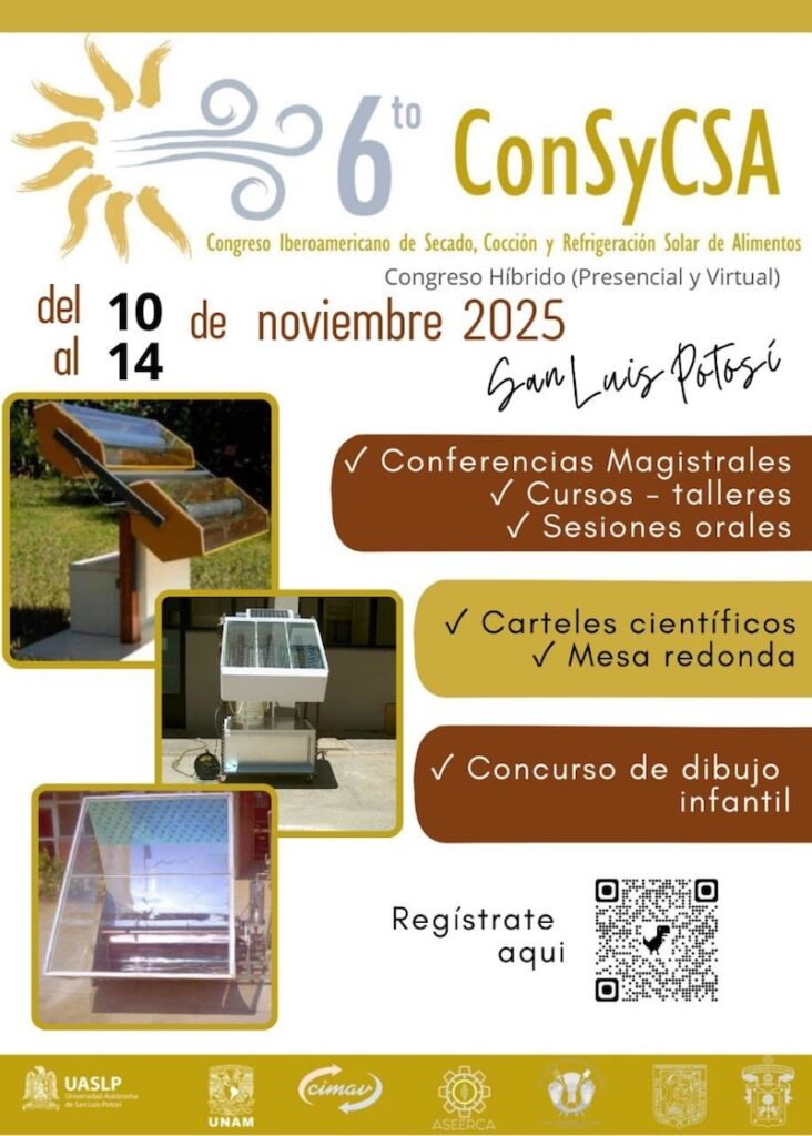 El Instituto de Física (IF) de la Universidad Autónoma de San Luis Potosí (UASLP) informa que se encuentra abierta la convocatoria de registro para participar en el VI Congreso Iberoamericano del Secado, Cocción y Refrigeración Solar de Alimentos (ConSyCSA), que se llevará a cabo en las instalaciones del Edificio Central de la Universidad, dio a conocer la doctora Fátima María Isabel De los Santos García.