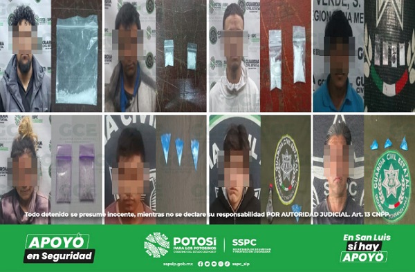 Francisco “N” de 28 años de edad, fue detenido en la zona centro de Soledad de Graciano Sánchez, luego de asegurarle cuatro dosis de “cristal” y una motocicleta; en la misma zona, Cristian “N” de 21 años, fue asegurado también con cuatro dosis de “cristal”; sobre la colonia La Virgen, Luis “N” de 23 años, fue asegurado con una dosis de “cristal”; sobre el fraccionamiento Cervantes, Jesús “N” de 27 años, quedó detenido con dos dosis de “cristal”; mediante los patrullajes en la colonia San Francisco, Edson “N” de 22 años, fue asegurado con dos dosis de “cristal”.