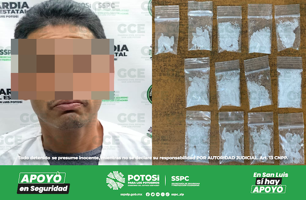 San Luis Potosí, S.L.P.- Acciones de inteligencia desarrolladas en la capital del estado, permitieron la captura de un supuesto vendedor de droga; autoridades de la Guardia Civil Estatal (GCE) detuvieron al presunto delincuente con varias dosis de “cristal” en su poder.