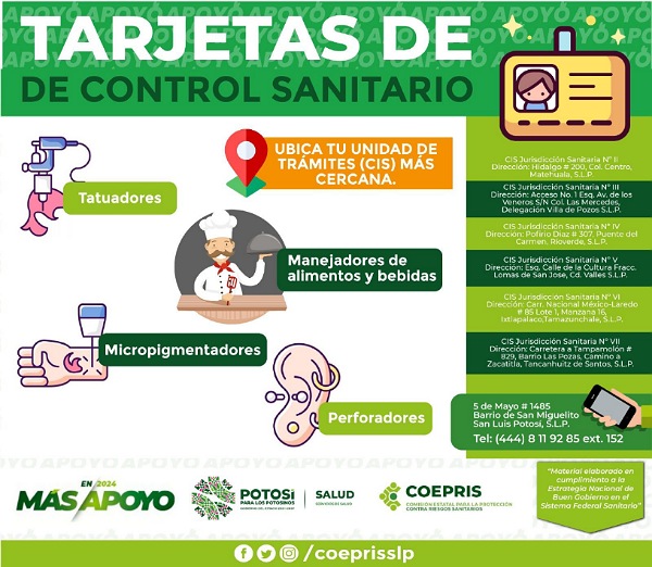 La tarjeta para Manejadores de Alimentos es un documento sanitario que avala la capacitación y salud del operario que está en el área de proceso de alimentos, por lo que es requisito indispensable en establecimientos tanto fijos como semifijos de preparación de alimentos y bebidas, con el fin de proteger a la población de posibles riesgos de contraer enfermedades transmitidas por alimentos, señaló. Para adquirir la Tarjeta los manipuladores de alimentos pueden acudir al Centro Integral de Servicios ubicado al interior de las instalaciones de COEPRIS en 05 de mayo #1485, Barrio de San Miguelito y para el interior del estado, se deberá acudir a las seis Jurisdicciones Sanitarias.