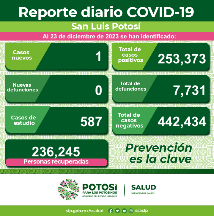 El nuevo caso se detectó en la capital potosina en la Jurisdicción Sanitaria I; en personas residentes de otra entidad, así como en las jurisdicciones sanitarias, II de Matehuala, III de Villa de Pozos, IV de Rioverde, V de Ciudad Valles, VI de Tamazunchale y VII de Tancanhuitz no se presentaron contagios nuevos.
