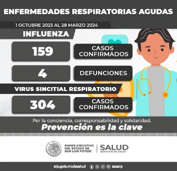 Al registrarse cuatro nuevos casos de influenza del 22 al 28 de marzo, suman 159 casos acumulados de octubre 2023 inicio de la temporada invernal a marzo 28 del 2024, y al no haber nuevos casos de de virus sincitial respiratorio, se mantiene la cifra de octubre 2023 a marzo 28 2024 en 304.