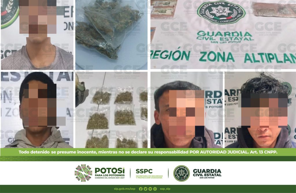 En el municipio de Rioverde, elementos de la Guardia Civil Estatal detuvieron a Pedro de 27 años de edad con dos dosis de marihuana, durante un operativo en el Ejido Puente del Carmen; a su vez, en el municipio de Cárdenas, elementos estatales detuvieron a Raúl de 19 años con 9 bolsas que contenían marihuana; por último, en el municipio de Matehuala, elementos de seguridad detuvieron a Gerardo de 24 años de edad y a Roberto de 34 años, a quienes se le aseguraron cuatro bolsas con marihuana y 5 dosis de “cristal”; así como mil 150 pesos en efectivo.