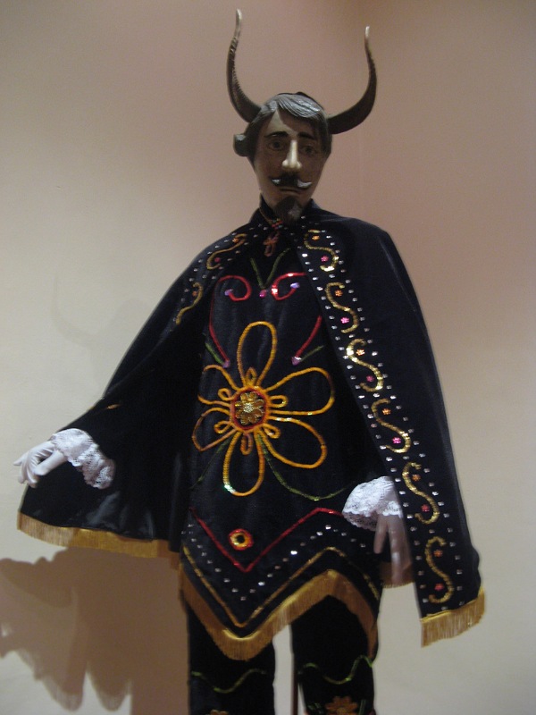 Este tipo de máscaras son realizadas en madera finamente tallada y policromada, de tipo antropomórfico, con cuernos incrustados de cornamenta de chivo, representando al diablo, un personaje socarrón dicharachero y bailador, habitualmente vestido de color rojo con harapos y ropa vieja, pero en este caso es un elegante diablo vestido a la usanza colonial novohispana.