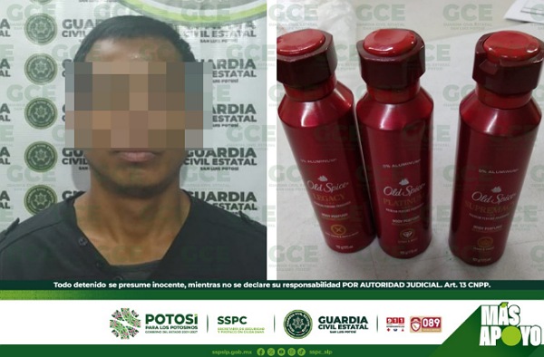 San Luis Potosí, S.L.P.- Una alerta del personal de un supermercado, movilizó a la Guardia Civil Estatal a la colonia Estrellas de Oriente, en la capital potosina, ahí detuvieron a un hombre, señalado del probable delito de robo de productos de higiene personal.