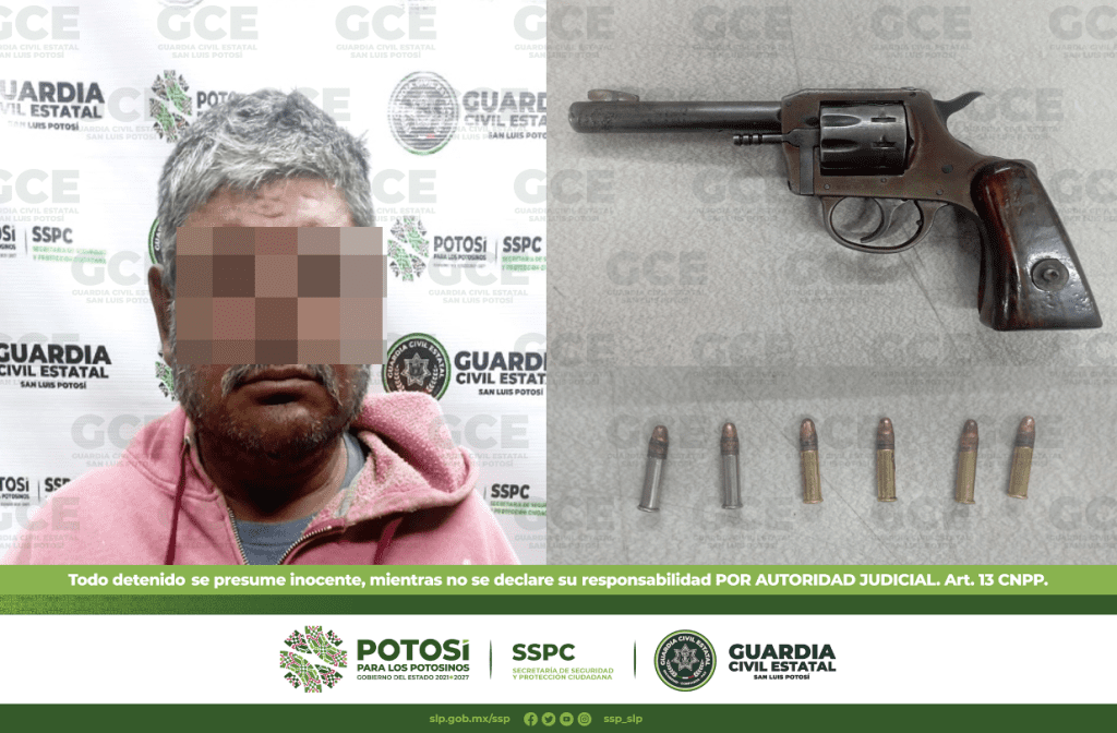 San Luis Potosí, S.L.P.- Como parte de las acciones dispuestas para combatir situaciones que ponen en riesgo a la ciudadanía, un hombre que deambulaba con un arma de fuego en la delegación de Bocas, fue detenido por la Guardia Civil Estatal (GCE).