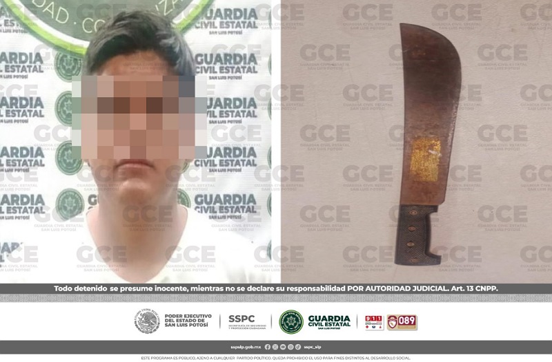 San Luis Potosí, S.L.P.- Patrullajes de seguridad y vigilancia, desdoblados por oficiales de la Guardia Civil Estatal (GCE), permitieron la detención de un hombre, quien presumiblemente se desplazaba con un machete.