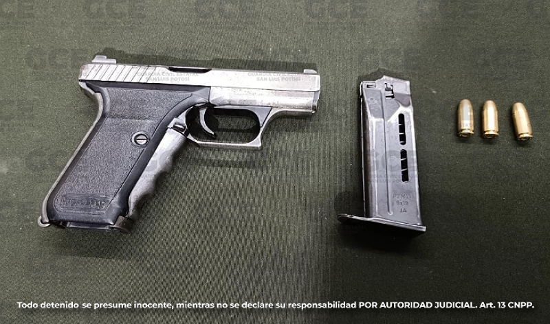 Oficiales estatales y municipales atendían los reportes ciudadanos sobre posibles hechos delictivos en esta zona, cuando en la calle de Pino Suárez, visualizaron a un joven que portaba lo que parecía ser un arma de fuego, de inmediato le dieron alcance. Mediante los protocolos de seguridad y actuación policial, lo despojaron de un arma de fuego calibre 9 milímetros, la cual tenía un cargador con tres cartuchos útiles.