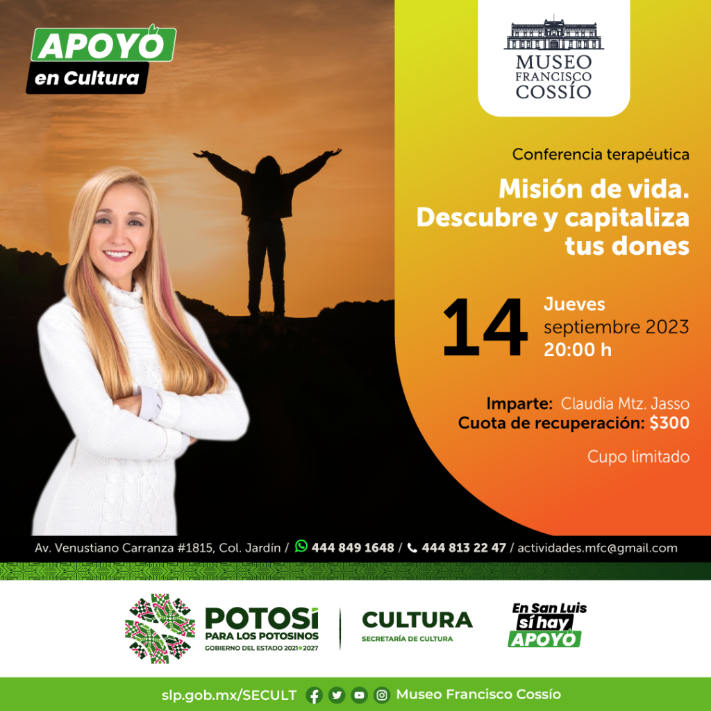 En San Luis Potosí si hay apoyo en cultura en sus distintas manifestaciones, por este motivo, la Secretaría de Cultura de Gobierno del Estado invita al público interesado, a participar en la conferencia terapéutica “Misión de vida. Descubre y capitaliza tus dones”, por Claudia Martínez Jasso, este jueves 14 de septiembre a las 20:00 h, en el Museo Francisco Cossío.