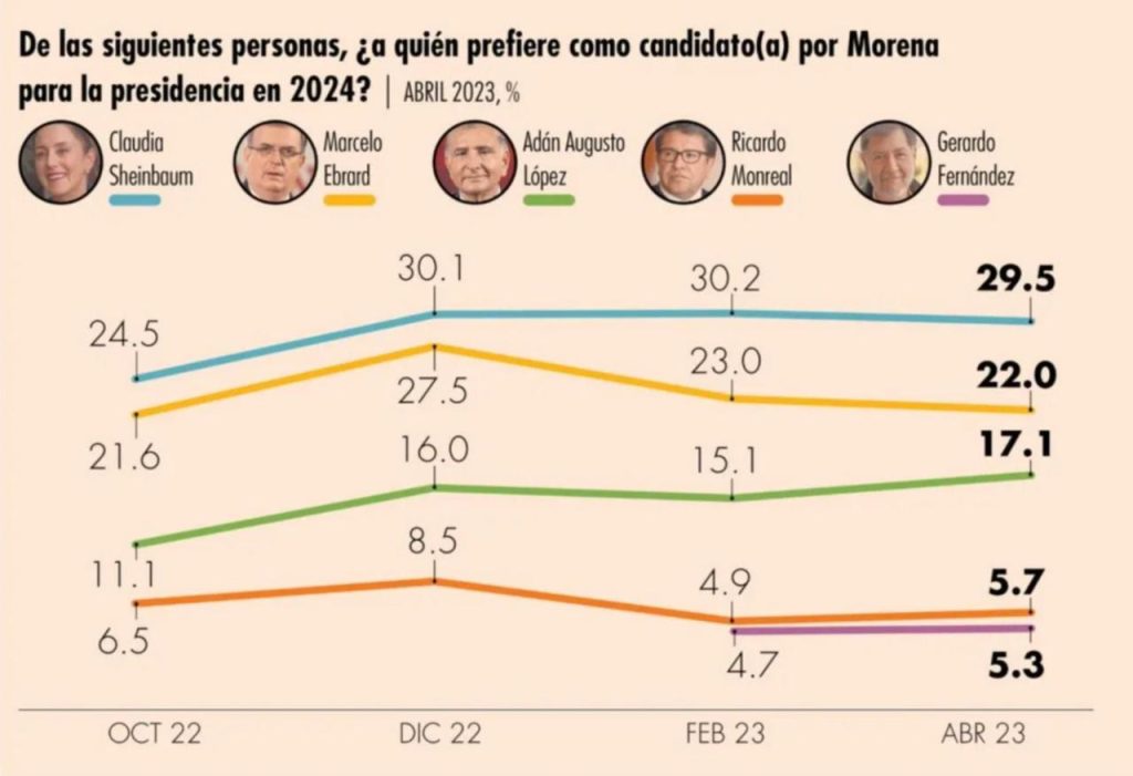 Hacia el interior de MORENA el monitoreo recogió que Claudia Sheinbaum encabeza las preferencias para ganar la candidatura con 29.5; le sigue Marcelo Ebrard con 23.0; Adán Augusto 17.1; Ricardo Montreal 5.7, Gerardo Fernandez Noroña aparece en último lugar con 5.3.