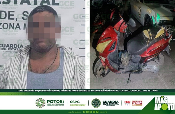 Rioverde, S.L.P.- Como parte de las labores preventivas que realiza la Guardia Civil Estatal en la Región Media, un motociclista fue detenido en la colonia La Victoria, por presuntos delitos contra la seguridad al poner en peligro su integridad y la de terceras personas.