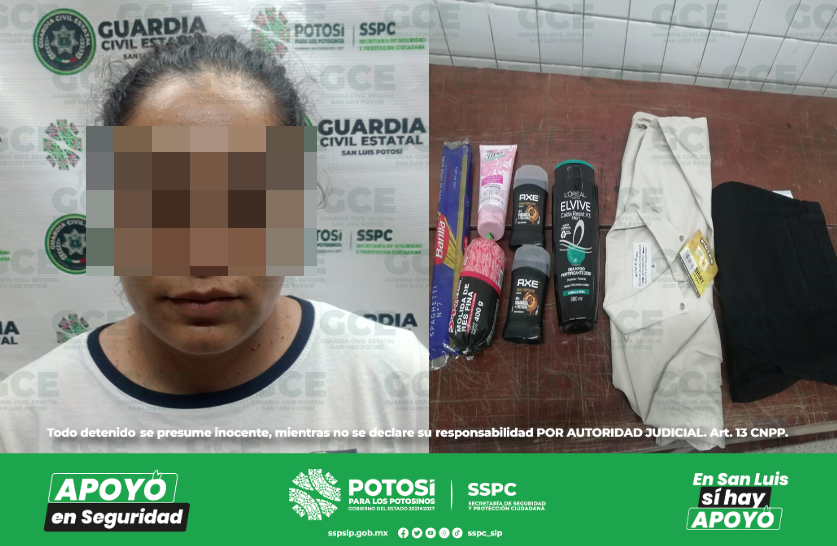 San Luis Potosí, S.L.P.- Elementos de la Guardia Civil Estatal (GCE) detuvieron a una mujer en la colonia Hacienda de Bravo, en la capital potosina, tras ser descubierta por personal del lugar tratando de huir con mercancía diversa; a petición de los afectados la mujer fue remitida a las autoridades.