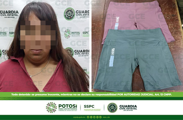 San Luis Potosí, S.L.P.- Personal de una tienda departamental solicitó mediante la Línea de Emergencias 911, el apoyo de la Guardia Civil Estatal (GCE) para la detención de una mujer, luego de ser sorprendida tratando de huir con prendas deportivas del lugar.