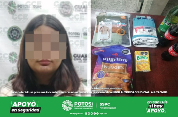 San Luis Potosí, S.L.P.- Gracias a la coordinación entre la Guardia Civil Estatal (GCE) y personal de un supermercado, una mujer fue detenida por el probable delito de robo; la mujer pretendía huir del lugar con varios productos del establecimiento.