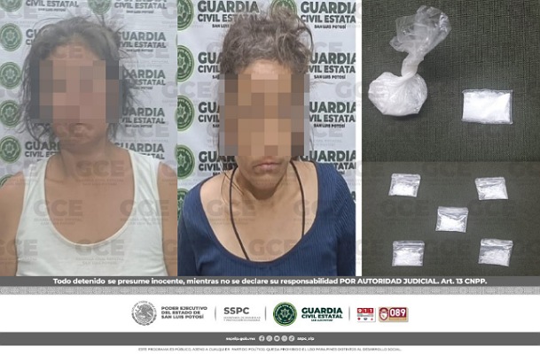 San Luis Potosí, S.L.P.- Tras dar seguimiento de las denuncias anónimas sobre posible actividad delincuencial en la localidad de El Panalillo, en la capital potosina, dos mujeres resultaron detenidas por la Guardia Civil Estatal (GCE), por el probable delito de posesión de narcóticos.