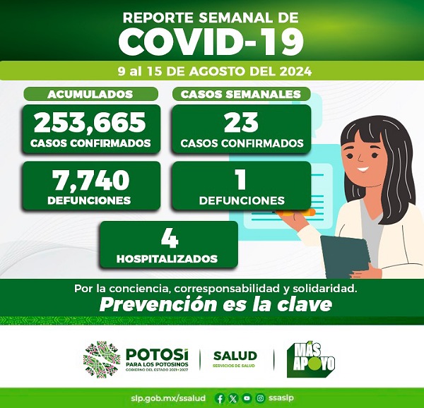 Del 9 al 15 de agosto se registran 23 nuevos contagios de COVID-19 confirmando el Comité Estatal para la Seguridad en Salud y los Servicios de Salud 253 mil 665 casos totales de esta enfermedad, y al presentarse una nueva defunción, la cantidad de muertes por el virus es de 7 mil 740 en el Estado.
