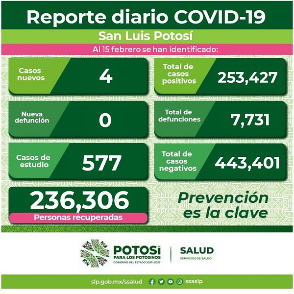 Los nuevos casos se detectaron en la Jurisdicción Sanitaria I de San Luis Potosí; en las jurisdicciones sanitarias, II de Matehuala, III de Villa de Pozos, IV de Rioverde, V de Ciudad Valles, VI de Tamazunchale y VII de Tancanhuitz no se presentaron casos nuevos ni en personas residentes de otra entidad.