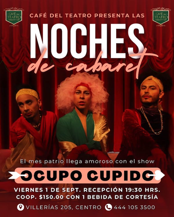 En San Luis Potosí si hay apoyo en cultura y promoción para artistas, creadoras y creadores independientes, por lo que la Secretaría de Cultura de Gobierno del Estado, invita a la presentación de Noches de Cabaret en el Café del Teatro (a un costado de las taquillas del Teatro de la Paz), con la función Ocupo Cupido de Alan España y Aldo Reséndiz, el viernes 7 de abril a las 19:30 h, con una cuota de recuperación de $150 pesos, con bebida de cortesía.