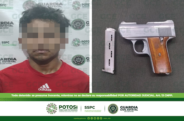 San Luis Potosí, S.L.P.- En seguimiento a los reportes sobre un probable criminal dedicado al robo a transeúnte y robo de vehículo, oficiales de Guardia Civil Estatal (GCE) desplegaron un operativo que derivó en la detención de un objetivo delincuencial prioritario, que fue detenido por probable portación de un arma de fuego.