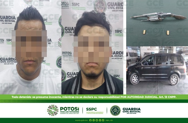 San Luis Potosí, S.L.P.- Labores operativas de inteligencia, efectuadas por elementos de la Guardia Civil Estatal (GCE), permitieron la captura de dos presuntos miembros de una red criminal, a quienes se les aseguró un arma de fuego.