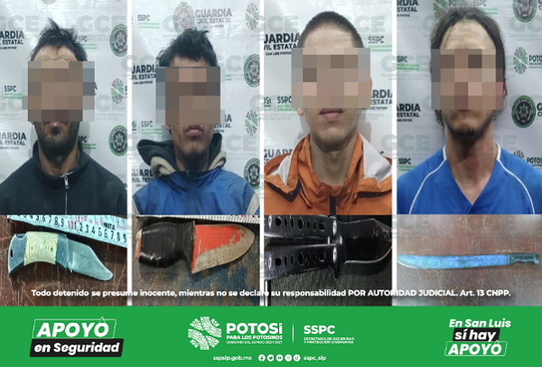 Agentes de la GCE detuvieron en la colonia San Luis Rey, a Ángel “N” de 30 años de edad, con un cuchillo de 22 centímetros; por su parte, en la colonia Imperio Azteca, José “N” de 18 años fue detenido con una navaja de 23 centímetros. Por su parte, en el municipio de Soledad de Graciano Sánchez, Luis “N” de 26 años, fue detenido en la colonia La Lomita Segunda Sección, tras sorprenderlo con un machete; por último, en la colonia Las Hadas, José “N” de 34 años, fue asegurado con una navaja.