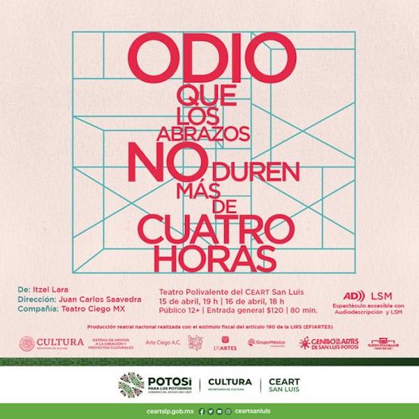 La Compañía Teatro Ciego MX, llega al Centro de las Artes San Luis Potosí con la obra teatral Odio que los abrazos no duren más de cuatro horas, un espectáculo inspirado en “La separación de los amantes” de Igor Caruso, que cuenta con actores, actrices, músicos y cantantes ciegos, poniendo en juego la relación de cuerpos con ceguera en espacios no convencionales valiéndose del sonido como vehículo dramático, por lo que la Secretaría de Cultura de San Luis Potosí, invita a las presentaciones que se llevarán a cabo en el Teatro Polivalente los próximos 15 y 16 de abril, a las 19:00 y 18:00 horas. respectivamente.