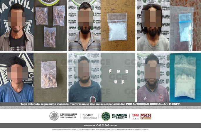 Sobre la colonia Genovevo Rivas Guillén, Jesús “N” de 34 años de edad, fue detenido con una dosis de “cristal”; en la comunidad de La Constancia, Juan “N” de 32 años, quedó detenido con una bolsa que contenía “cristal”; Francisco “N” de 28 años, quedó detenido con una bolsa con marihuana. Por su parte, en el municipio de Villa de Reyes, elementos de la GCE detuvieron a Mario “N” de 29 años de edad, con cinco dosis de “cristal”.